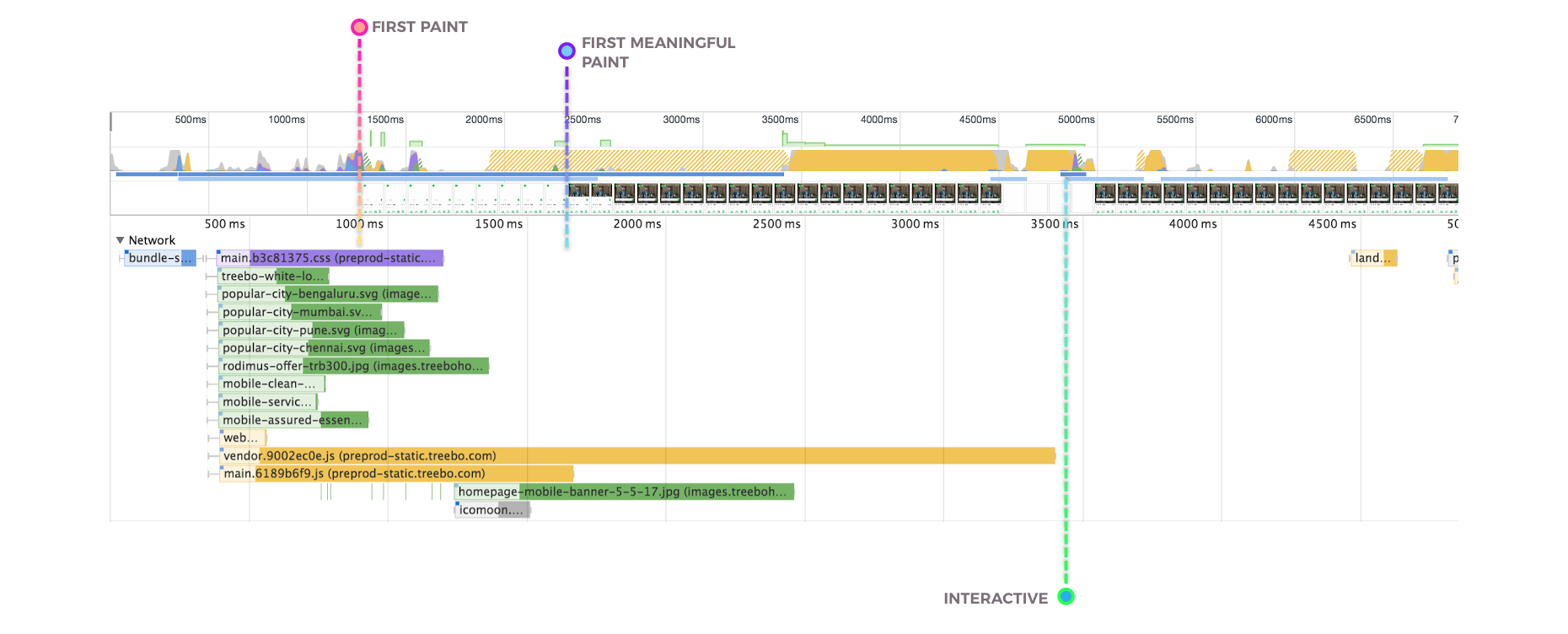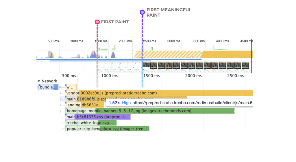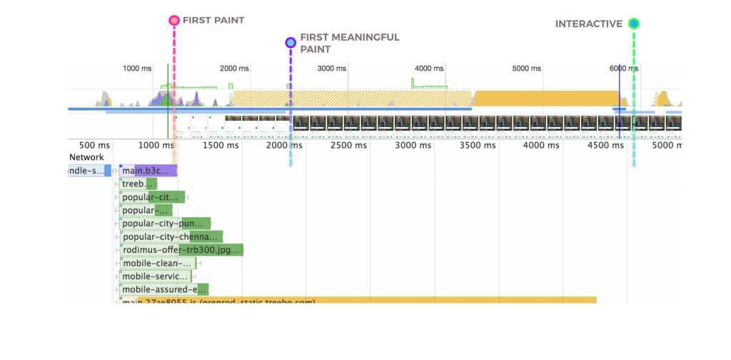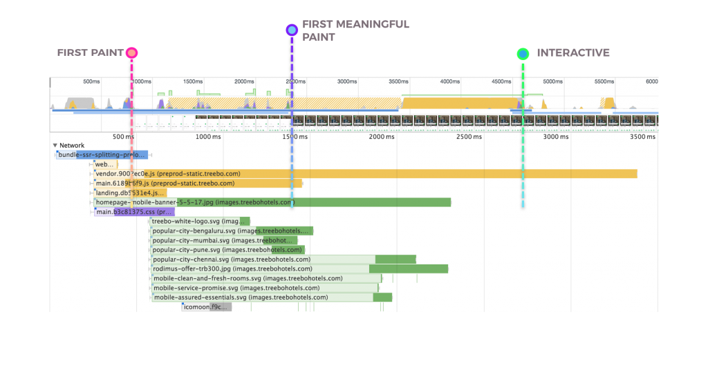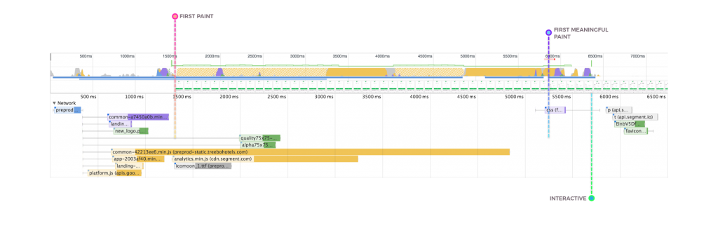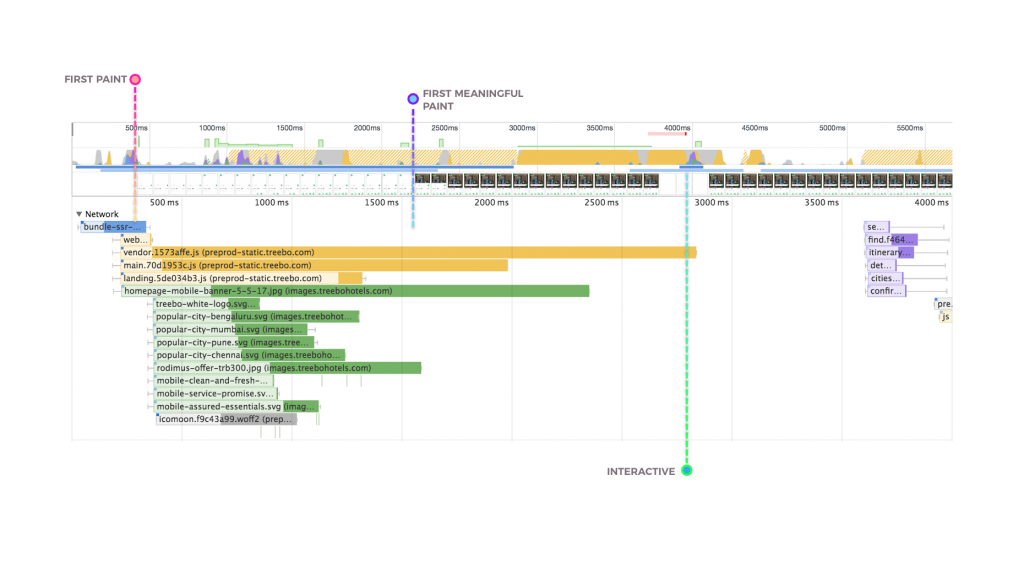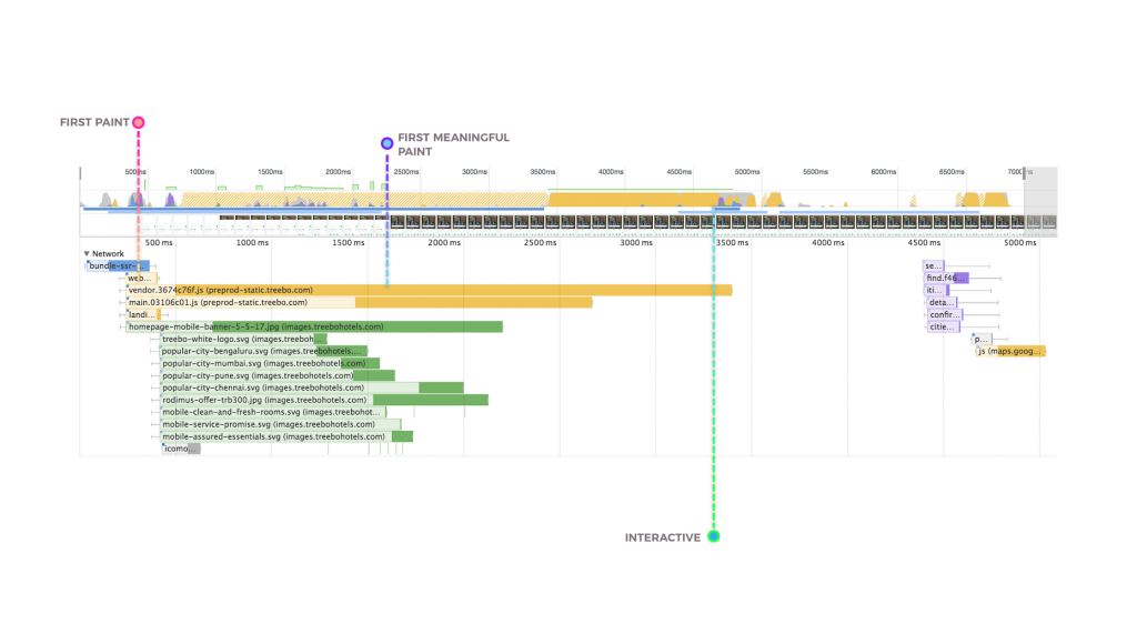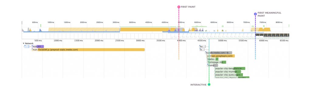 Treebo的上一代移动网站是用Django开发的单体应用。用户的每个页面跳转都需要一个服务器端请求。上一代的白屏时间为1.5秒,首次有效绘制(first meaningful paint)时间为5.9秒,可交互时间为6.5秒。