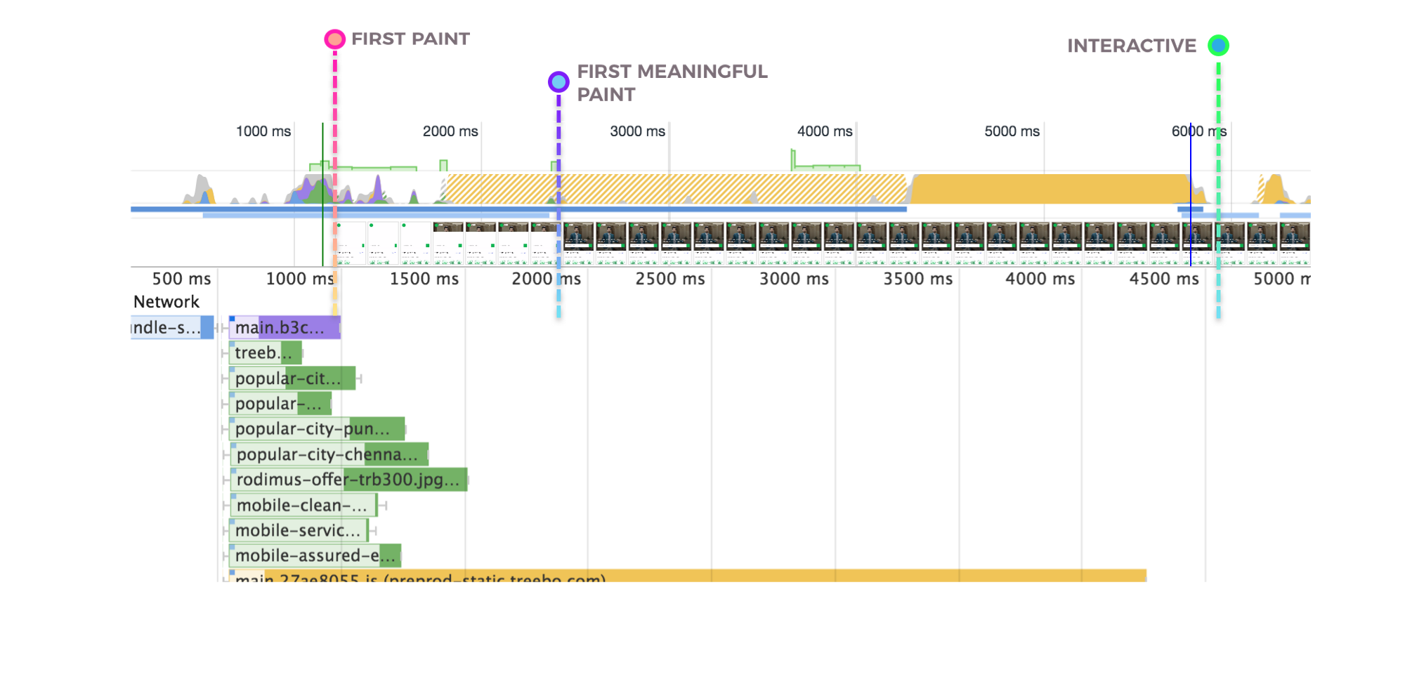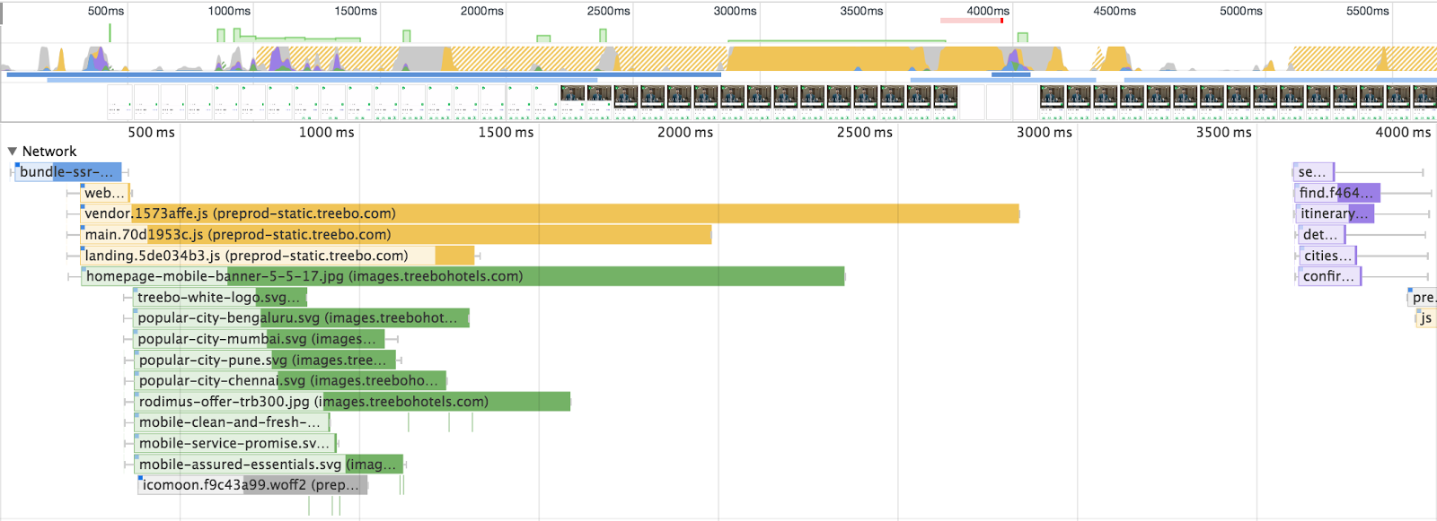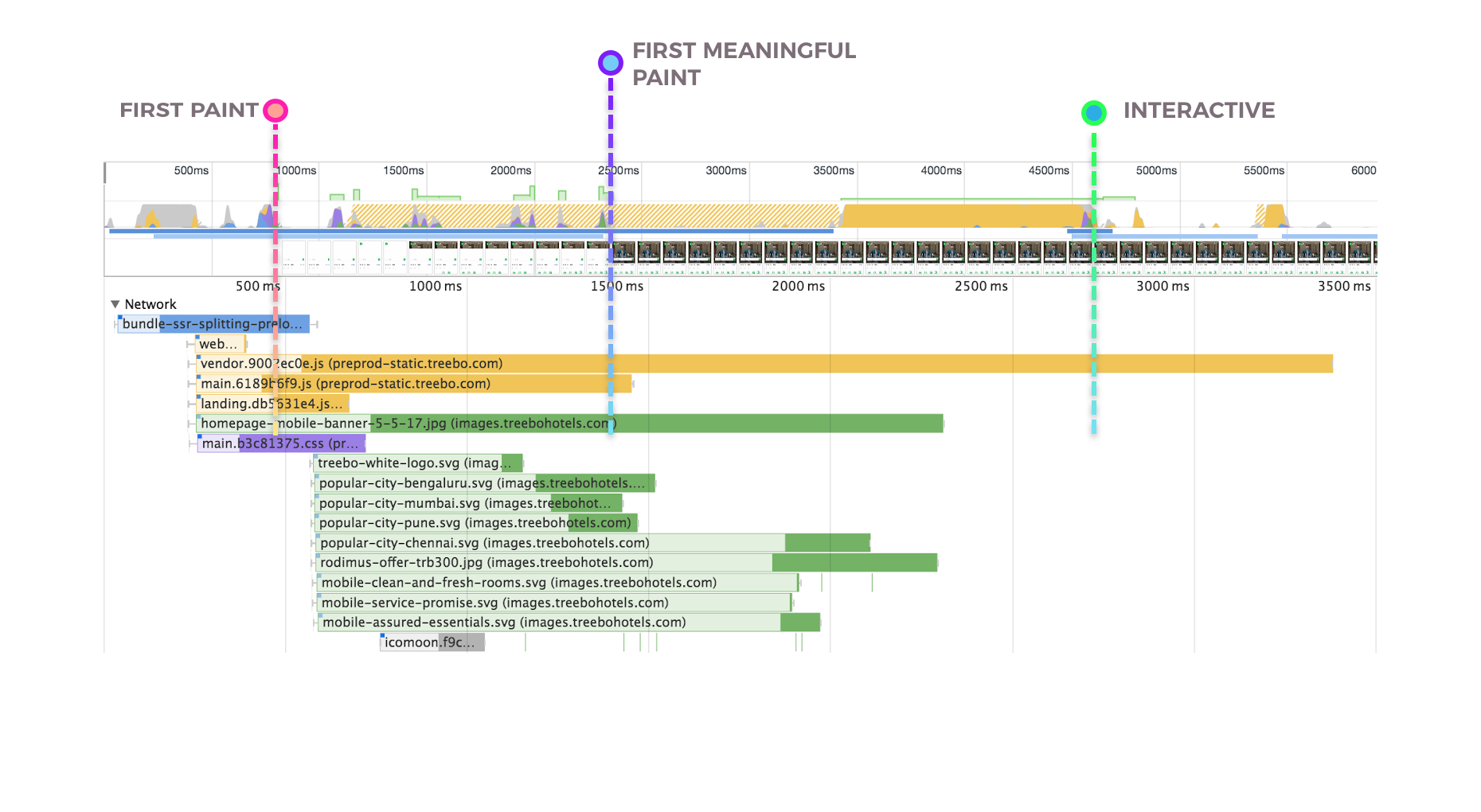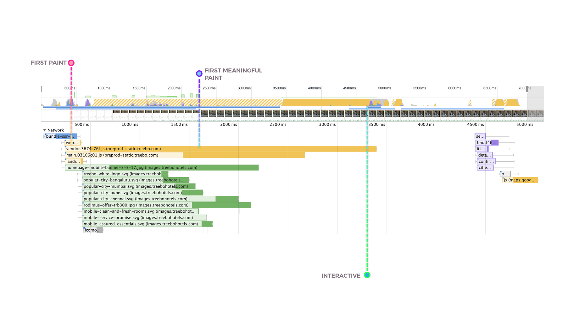 Treebo的上一代移动网站是用Django开发的单体应用。用户的每个页面跳转都需要一个服务器端请求。上一代的白屏时间为1.5秒,首次有效绘制(first meaningful paint)时间为5.9秒,可交互时间为6.5秒。