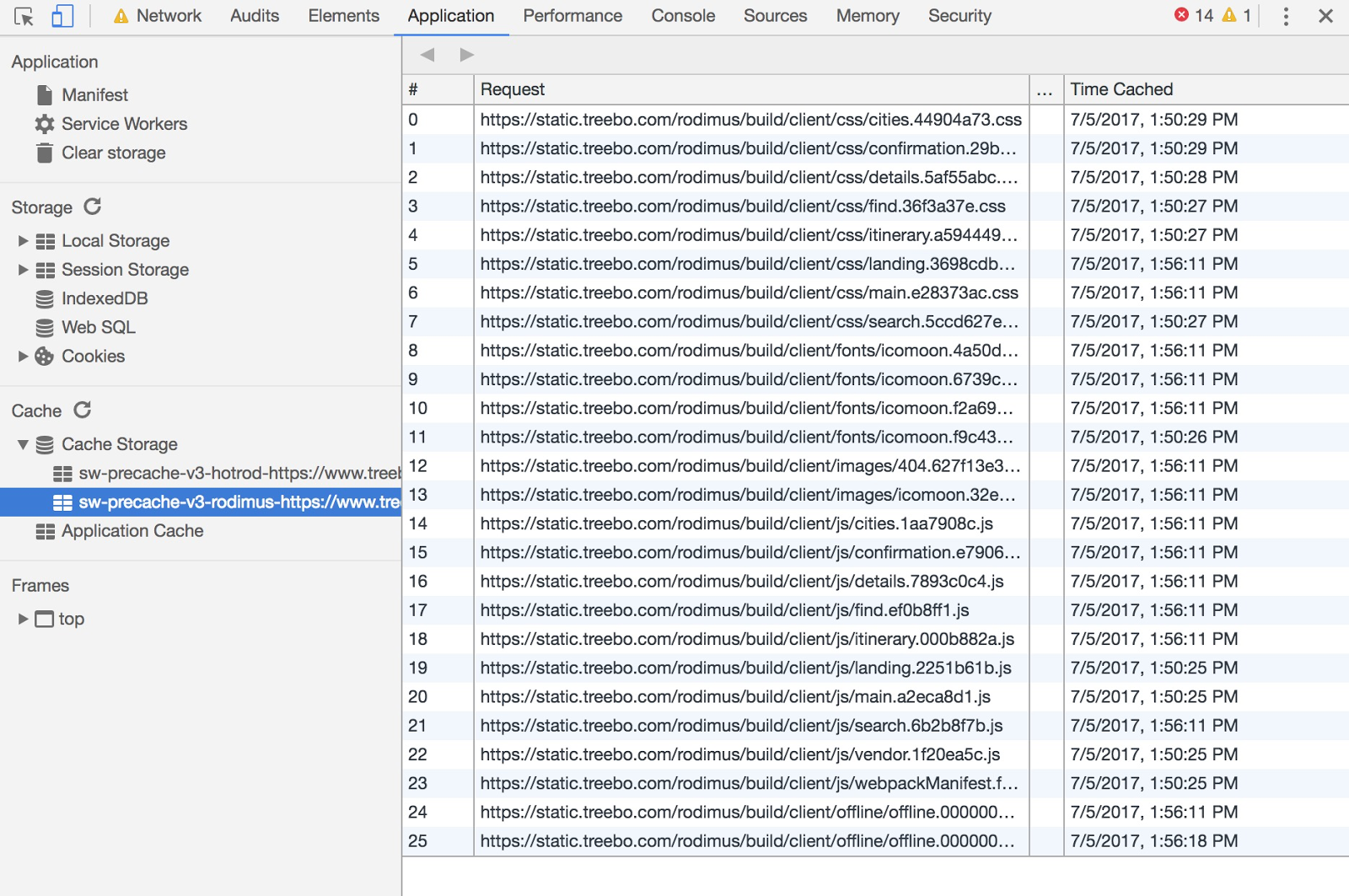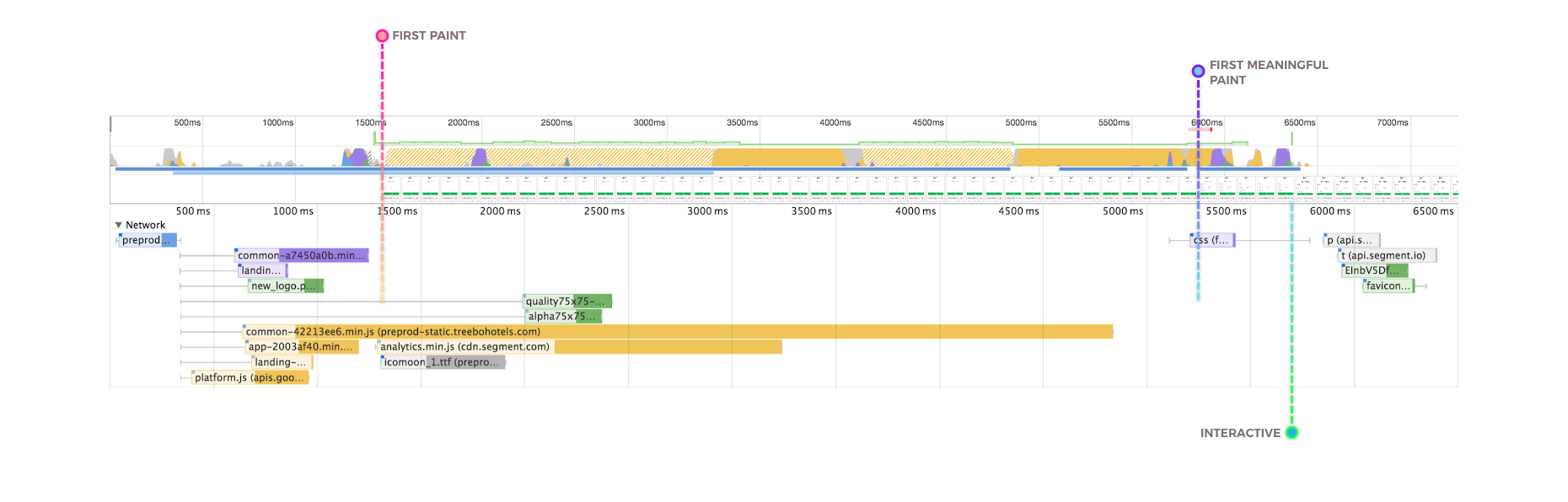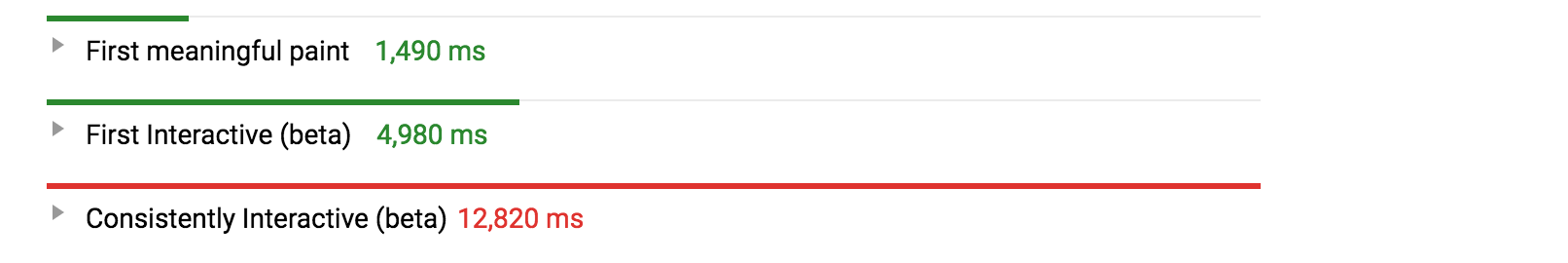 理想状况下,Treebo并不希望在页面初始化时就读取所有组块,这是因为他们想避免与关键资源下载争抢带宽——如果没有利用服务工作线程缓存,这也会浪费移动端用户宝贵的带宽资源。如果看一下Treebo在诸如持续可交互时间(Consistently Interactive)这样的指标上的表现,他们还有很大进步空间: