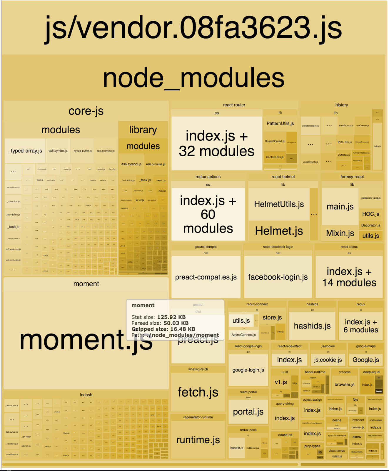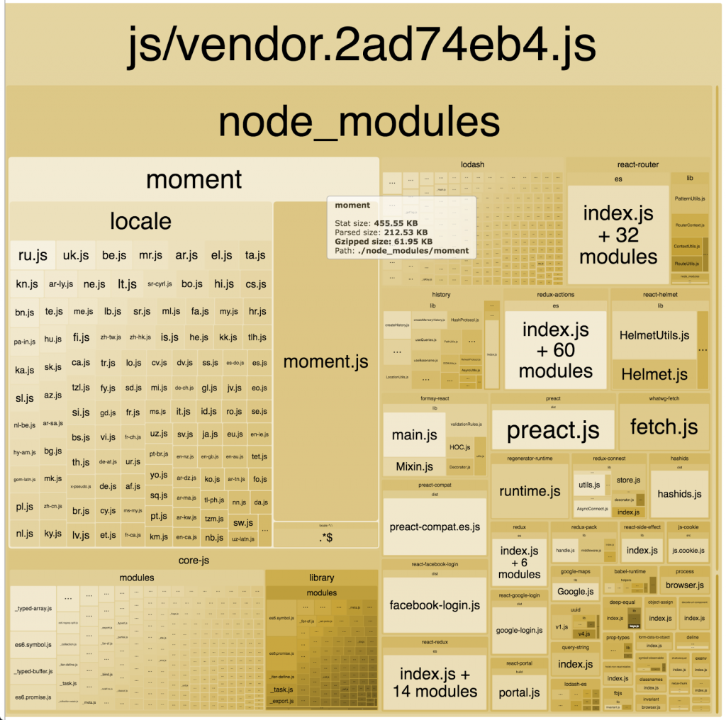 Treebo重度依赖moment.js处理日期。当你导入moment.js并用Webpack构建后,默认情况下包含了moment.js本身和它的所有地区信息,捆绑包会增大约61.95KB(gzip压缩后)。这对你最终的第三方依赖捆绑包的体积有较大影响。